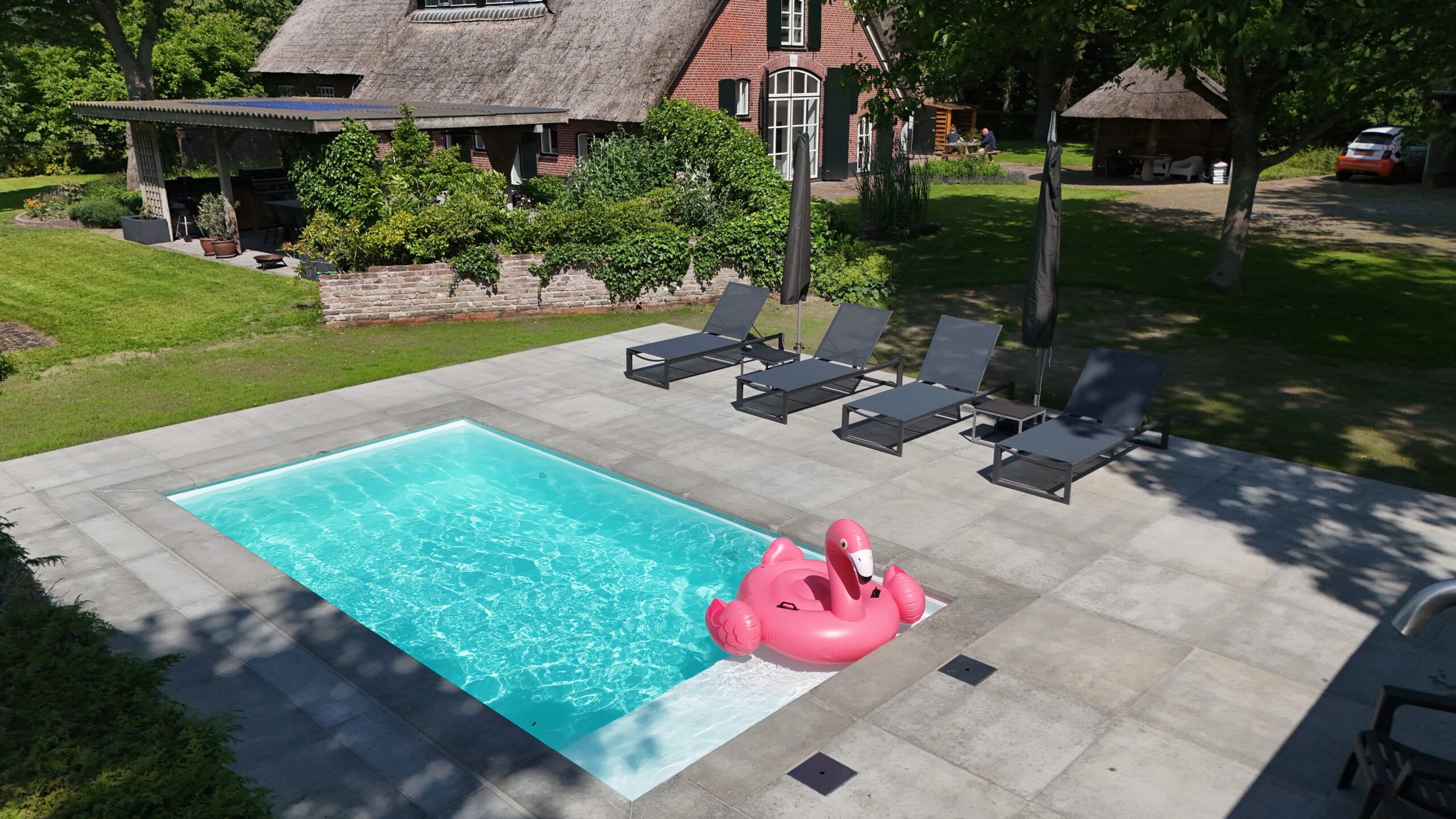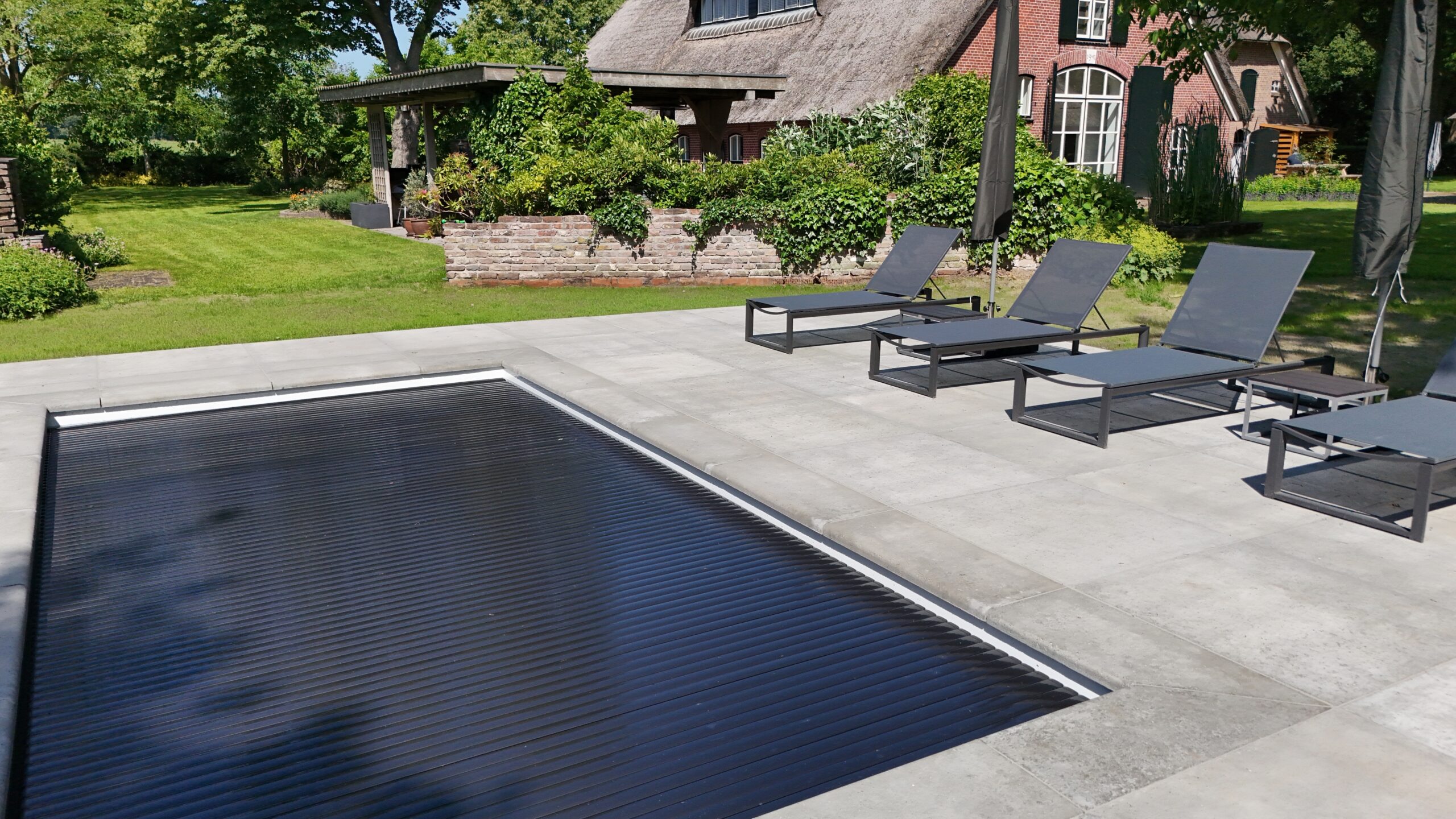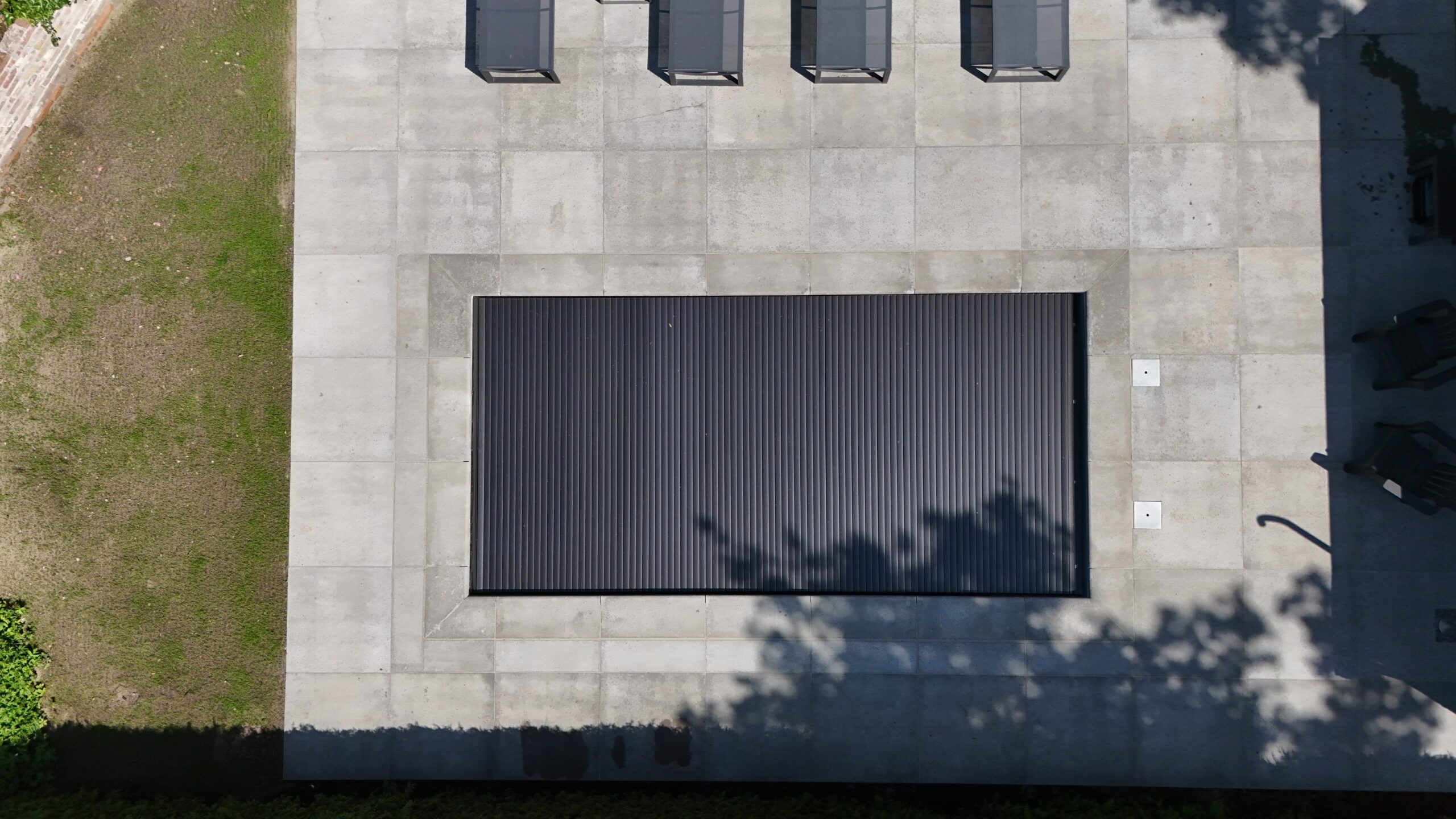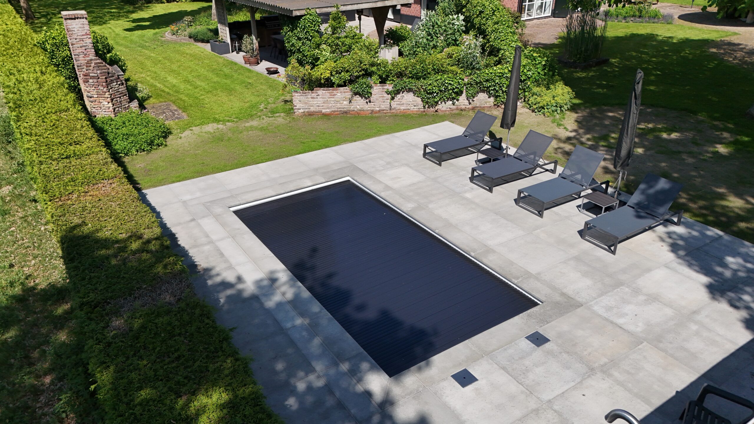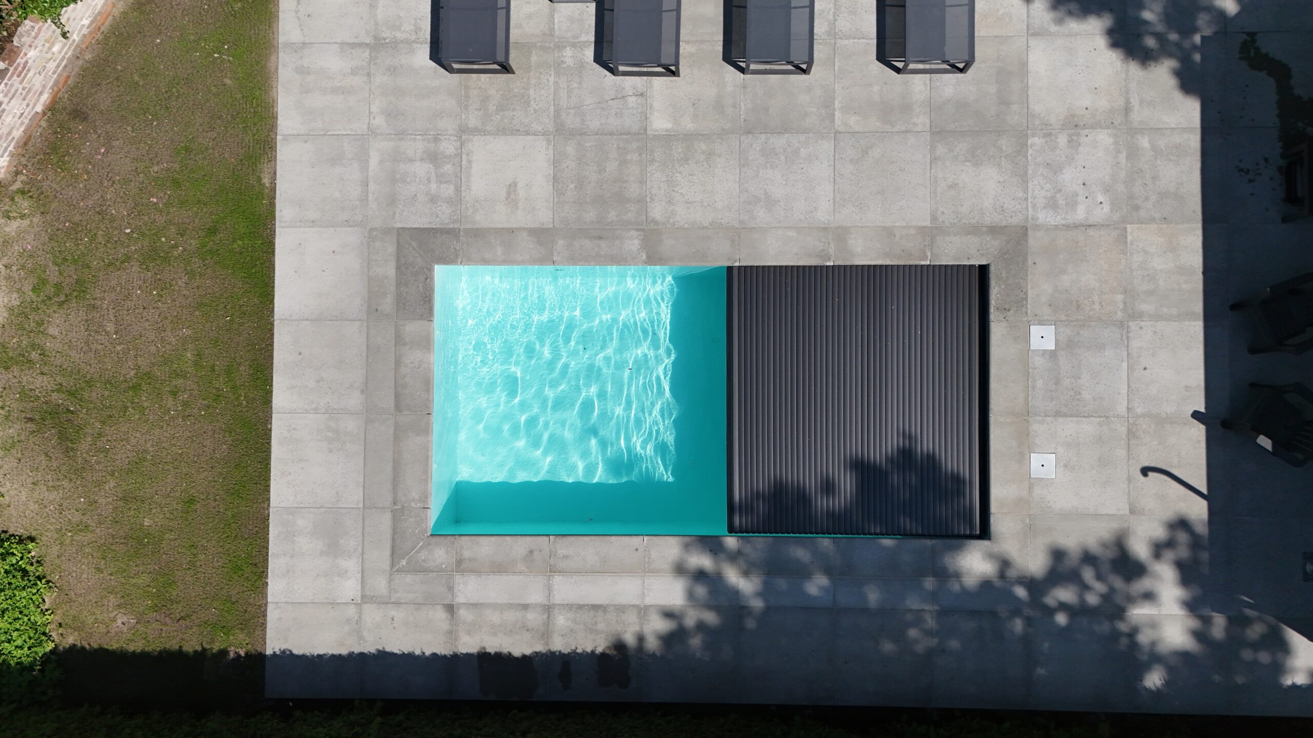 Het zwembad is bovendien uitgerust met een polycarbonaat lamellenafdekking in de kleur carbon. Deze stijlvolle afdekking biedt niet alleen veiligheid en energiebesparing, maar sluit ook prachtig aan bij de moderne uitstraling van het bad.